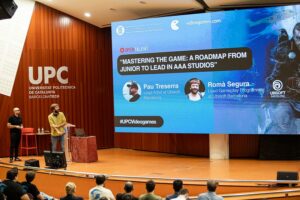 La conferència central d’aquest any, sota el nom de “Mastering the Game: A Roadmap from Junior to Lead in AAA Studios”, va anar a càrrec de Pau Tresserra i Romà Segura, d’Ubisoft Bcn, que ens van fer un recorregut sobre l’evolució de les seves carreres en indústria del videojoc fins a haver aconseguit la posició de Lead. Van compartir la seva visió de la professió i dels rols i les dinàmiques que marquen la diferència en l’èxit de les produccions. Des de la seva consolidada experiència al sector dels videojocs, van acabar les seves intervencions donant alguns consells als assistents, tant des del vessant de programació com del d’art.