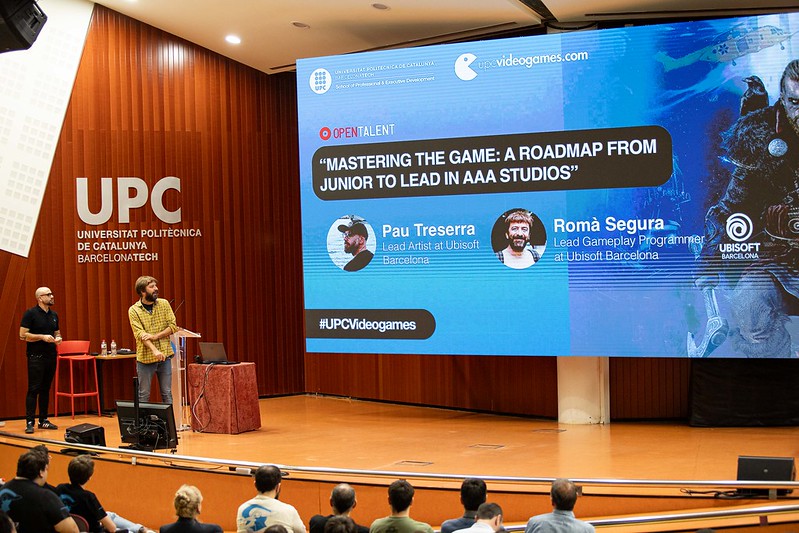 La conferencia central de este año, bajo el nombre de «Mastering the Game: A Roadmap from Junior to Lead in AAA Studios», estuvo a cargo de Pau Tresserra y Romá Segura, de Ubisoft Bcn, que nos hicieron un recorrido sobre la evolución de sus carreras en industria del videojuego hasta haber alcanzado su posición de Lead. Compartieron su visión de la profesión y de aquellos roles y dinámicas que marcan la diferencia en el éxito de las producciones. Desde su consolidada experiencia en el sector de los videojuegos, acabaron sus intervenciones dando algunos consejos a los asistentes, tanto desde la vertiente de programación como la de arte.