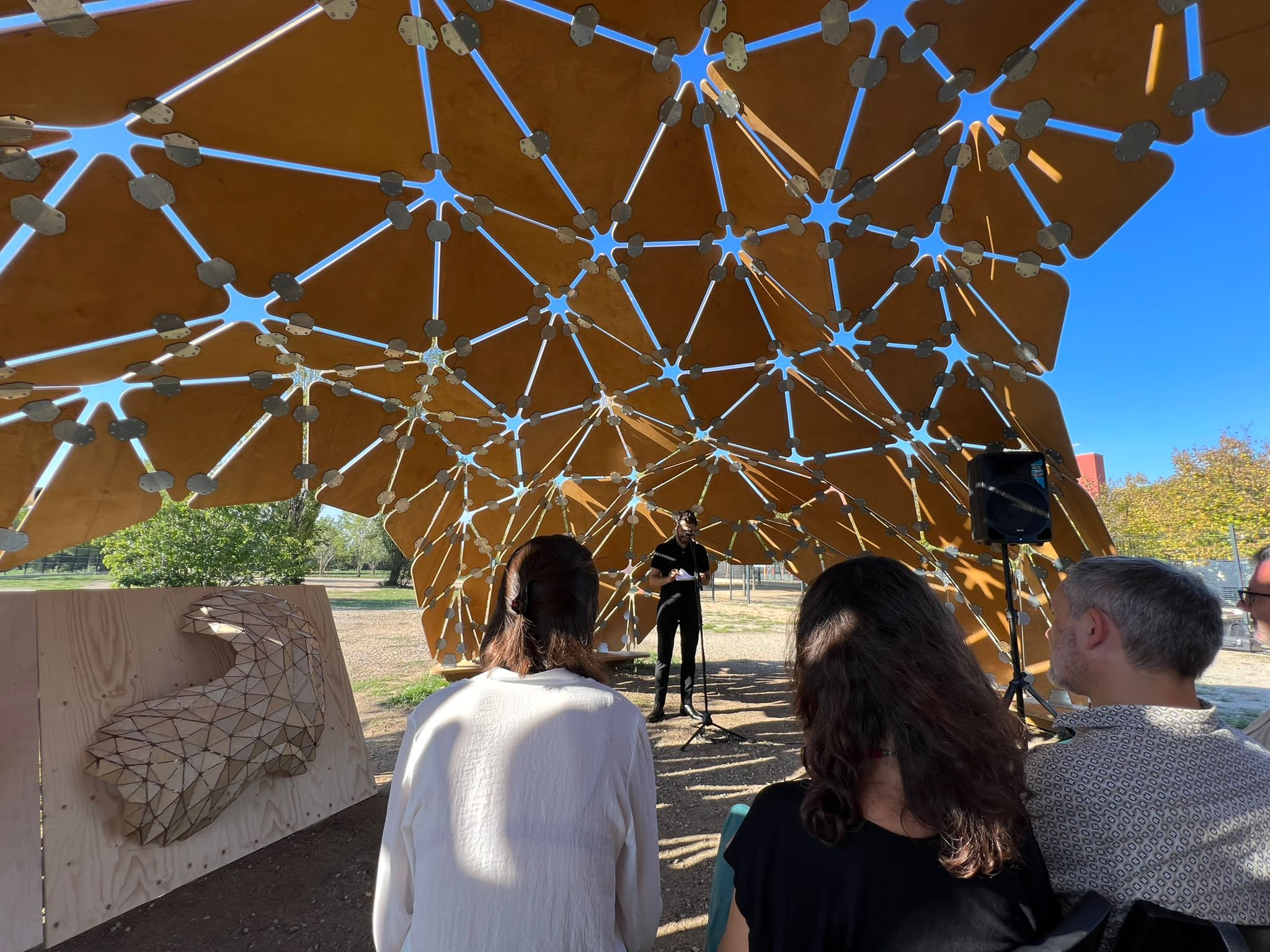 Un grupo de estudiantes del máster en Parametric Design in Architecture de la UPC School, con la colaboración de profesorado de la ETSAV, han concebido y construido con éxito Pentaura Shell, un refugio climático de madera para la escuela pública Turó de Can Mates de Sant Cugat del Vallès, construido con carcasas fabricadas digitalmente.